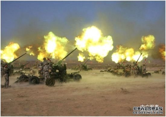 防空火炮阵地密集开火