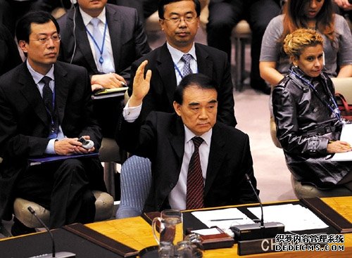 • 中国常驻联合国代表李保东在表决中投否决票。(资料图)