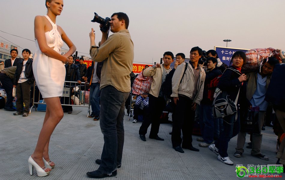 2007年春运,广州火车站广场附近,进站的旅客围观一位在此取景拍照的外国模特。