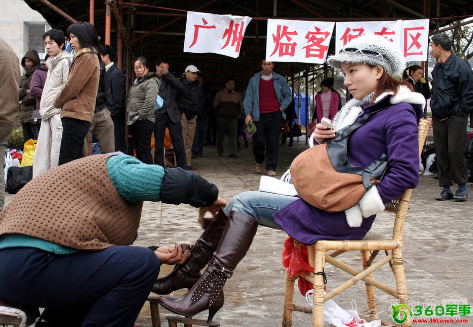 2006年2月5日,湖南省永州市火车站,归家前,一名候车的女士在小摊上擦亮皮鞋。