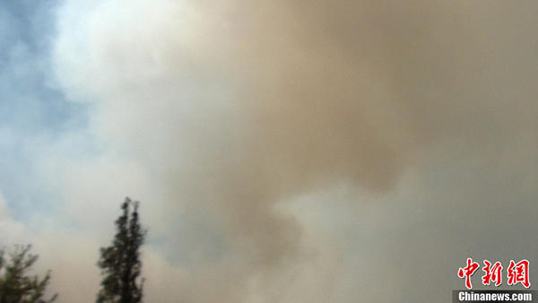 2月28日2时30分,昆明市宜良县阳宗海林场小白龙林区发生森林火情。凌晨4点,火线已经扩大到500米。截止11时,火势还未得到控制,2000余人正在火场紧急扑救。图为县区内浓烟密布。