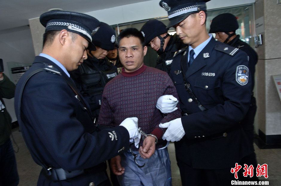 3月1日,根据最高人民法院院长签发的执行死刑命令,云南省昆明市中级人民法院依法对糯康、桑康·乍萨、依莱、扎西卡四名湄公河案罪犯执行了死刑。图为扎西卡被带出云南省看守所前往行刑地点。