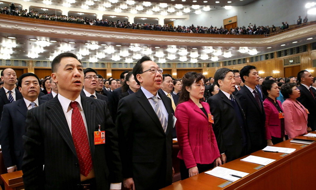 3月3日,中国人民政治协商会议第十二届全国委员会第一次会议在北京人民大会堂开幕。这是委员们高唱国歌。