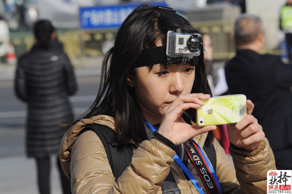 3月3日,北京,一位女记者头戴摄像机,颈上挂着相机、手持拍照手机报道两会