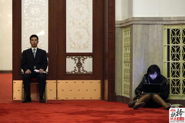 3月2日,一位记者在人民大会堂的会议现场写稿。