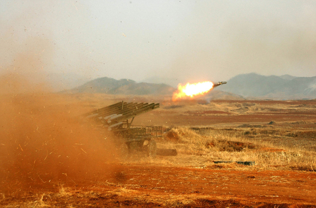 当地时间2013年2月26日消息,朝鲜最高领导人金正恩亲临炮兵部队现场指挥,以检阅部队的作战能力。图为朝中社提供的炮击场景,但并未透露具体日期。