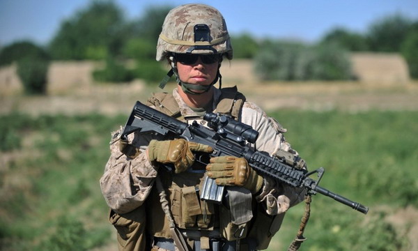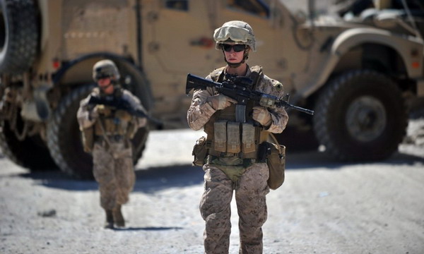 2012年6月6日,美国海军陆战队陆战第7团第1营所属女性战斗员正在阿富汗的赫尔曼德省地区进行战地巡逻。参加巡逻的女兵并没有因为性别而受到“照顾”,每个人都荷枪实弹全副武装以便随时战斗。